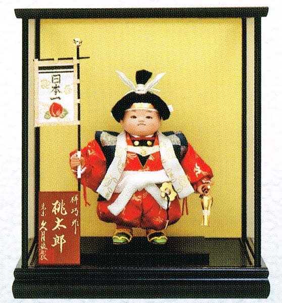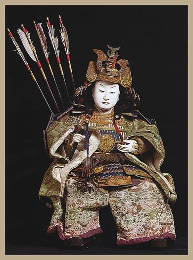En primer lugar, a Minamoto no Yoshitsune, considerado como el ideal del guerrero japonés y uno de los miembros más importantes que componen el panteón de las figuras escogidas para esta tipología de ningyô. Una de sus hazañas más importantes es la lucha y derrota del clan Taira durante las Guerras Genpei (algunas de las batallas libradas por este personaje están recogidas en la obra épica Heike Monogatari) igualmente, se le reconoce el mérito de su suicidio en la cumbre de su carrera. A la hora de representarlo se opta por una postura relajada, el momento después de haber salido victorioso en el combate. Sentado sobre un escabel, con la armadura completa de tal modo que en la placa que cubre el pecho aparece el ideograma del dragón (ryu) también presente en su casco; en su mano porta un abanico de batalla con el sol y la luna representados, uno de los elementos que permite identifica al general, y distintas armas como un arco con sus flechas. Destaca el cuidado en su rostro juvenil con una expresión seria y estoica.