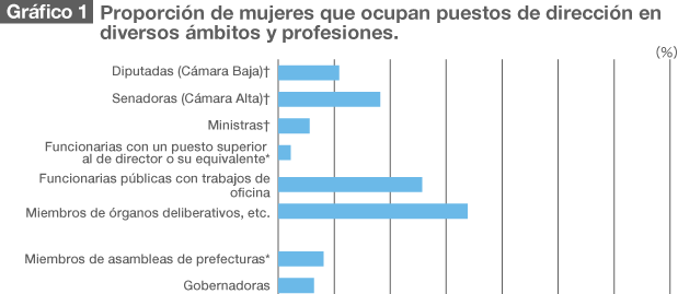 Porcentajes de mujeres en diferentes órganos de representación en el año 2010 (fuente: nippon.com).
