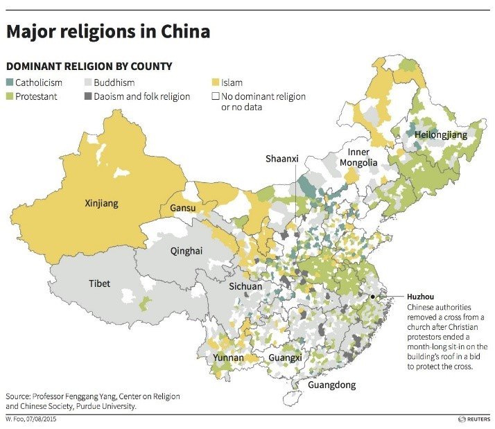 Mapa de las principales religiones practicadas en China, basado en las investigaciones del Dr. Fenggang Yang, director del Centro de Religión y Sociedad China de la Universidad Purdue (West Lafayette, Indiana). Fuente: Reuters.