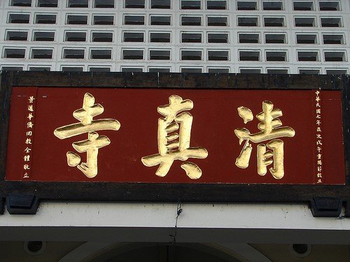 Los caracteres chinos aparecen principalmente en cartelas, que se disponen tanto en sentido vertical como en horizontal. Los caracteres en estos edificios están escritos con diferentes tipos de escritura, y pueden ser leídos por cualquier chino alfabetizado, aunque no serían entendidos por aquellos que no posean ciertos conocimientos de la religión. Es curioso que no exista una palabra o un carácter chino que transmita el concepto de Dios como un musulmán lo comprende, un problema con el que se encontraron también los cristianos nestorianos en el siglo VII.[30] La traducción de “Allah” fue transformándose sucesivamente, traducida en un principio como “Cielo” o “Buda”, y posteriormente como “Señor Verdadero”, “Único Verdadero” o el “Verdadero Soberano”, ya en la dinastía Ming; hoy se utiliza la transcripción fonética “Anla”. Mientras tanto, el Profeta fue denominado “Santo”, “Sabio” o “Sagrado”, los mismos términos que denominaban a Confucio.