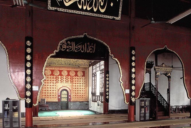 En el interior, el espacio se distribuye entre un bosque de columnas de madera, que se separan mediante arcos, que se suceden acentuando la perspectiva. Estos arcos reciben a su vez decoración pictórica, a la par que se tallan siguiendo múltiples estilos. Pero, sin duda, el espacio más ricamente decorado es el mihrab y el muro de la qibla, pues allí se disponen principalmente marcos y superficies de madera tallada sobre las que se representan complicadas composiciones epigráficas con hermosos versos coránicos.[23]