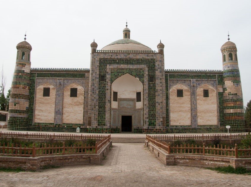 No hay que olvidar que estos lugares honran a personalidades políticas y religiosas, fueron construidos con los mejores materiales y tienen una función propagandística. El mausoleo de Afaq Khoja se encuentra en Kashgar, en la provincia de Sinkiang, y fue construido en el siglo XVII, aunque ha sido ampliado y reformado posteriormente. Es el mausoleo de la familia de Afaq Khoja, líder político de la región, y pertenece a un gran conjunto monumental que consta de cuatro mezquitas, salas de oración y lectura, la residencia del imán, un comedor, kioscos, y tumbas de fieles. La construcción funeraria es de mayores dimensiones que las mezquitas, todas ellas muy influenciadas por la arquitectura iraquí. Los edificios se ornamentan con cerámica vidriada y con la talla de motivos geométricos y vegetales, así como con pinturas de paisajes.