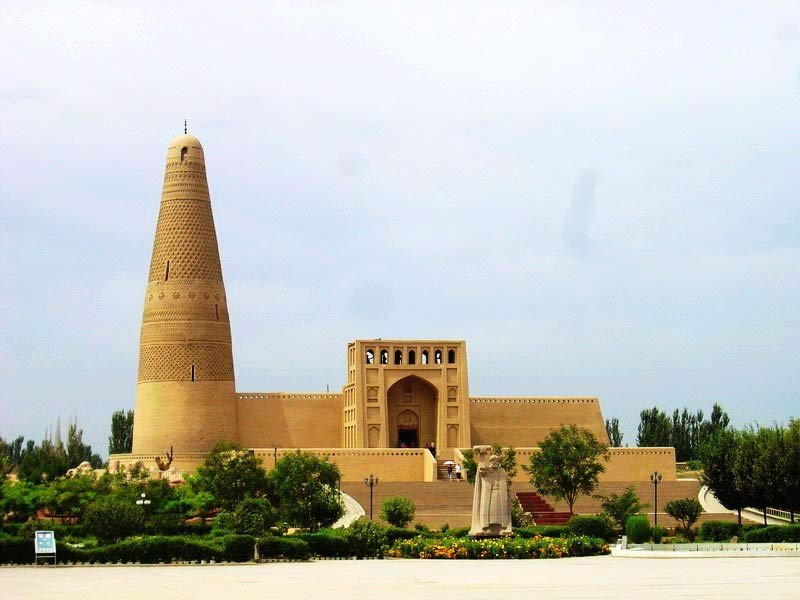 Un buen ejemplo es la mezquita uigur de Turfan (Sinkiang), construida en 1778 en honor a al soberano Emin Hedro, a instancias de su hijo Sulayman. Tras la muralla que cierra el recinto se encuentra una gran escalinata que lleva hasta la propia mezquita, a la que se accede a través de un gran iwan con un gran arco que da paso al patio. En la esquina sureste del edificio se adosa el alminar más alto de China, de 44 metros de altura y 14 metros de diámetro en su base circular, que se decora con diseños geométricos y florales creados con la disposición de las hiladas de los ladrillos. Caso similar es el de la mezquita Id Kah de Kashgar, construida en torno al año 1442, aunque algunos restos del edificio se remontan hasta el siglo X.