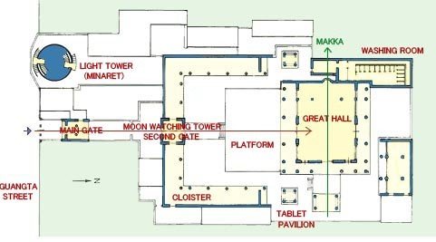 Las salas de oración constan de tres espacios diferenciados: un pórtico previo, donde los fieles pueden dejar sus zapatos antes de adentrarse en el interior de la sala, la sala de oración propiamente dicha, donde se hallan los elementos necesarios para el culto (como el mimbar), y una segunda sala de oración de menores dimensiones. Este segundo espacio de culto es una de las características de las mezquitas chinas, y posiblemente tenga su origen en la macsura, el espacio ocupado por el dirigente político o el imán en las oraciones comunitarias, que en el caso de China, sería ocupado por el imán o la persona que dirige la oración, o por un reducido grupo de creyentes, ya que allí los dirigentes políticos no seguían esta religión.
