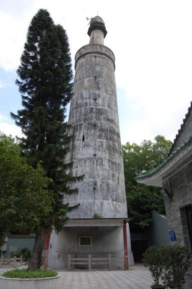 Las mezquitas no siempre incluyen un alminar, pues otros elementos pueden cumplir su función como lugar desde donde se lanza la llamada a la oración; en ocasiones desde lo alto de las grandes puertas monumentales o desde construcciones independientes. El alminar de la mezquita Huaisheng de Cantón es una de las construcciones islámicas más antiguas de toda China, ya que se cree erigido en el siglo X. Es una torre de ladrillo de planta circular, de 36 metros de altura, coronada por una cúpula apuntada. En su interior es recorrida por dos escaleras helicoidales independientes, algo frecuente en el arte islámico pero novedoso en la arquitectura china.[15] La tradición cuenta que la mezquita fue construida por Abi Waqqas, aunque es probable que fuese construida a ya bajo la dinastía Song (960-1279), siendo reconstruida tras varios incendios en los siglos XIV, XV y XX.