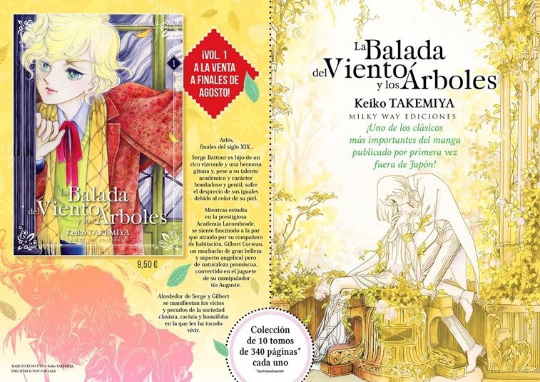 Hasta ahora era un sueño que las dos primeras obras Boys’ Love de la historia se pudieran disfrutar en España, pero Milky Way Ediciones ha logrado lo imposible, y es que en agosto de este 2018 publicó el primer tomo de La balada del viento y los árboles, de Keiko Takemiya, siendo la primera vez que esta obra se publica fuera de Japón.