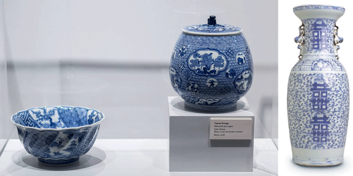 Conjunto de piezas expuestas donde se puede ver la relación de la cerámica de Tanzan con la tradición: cerámica de estilo Shonzui hecha por Tanzan (izquerda) y cerámica procedente de china blanca y azul del siglo XIX (derecha).