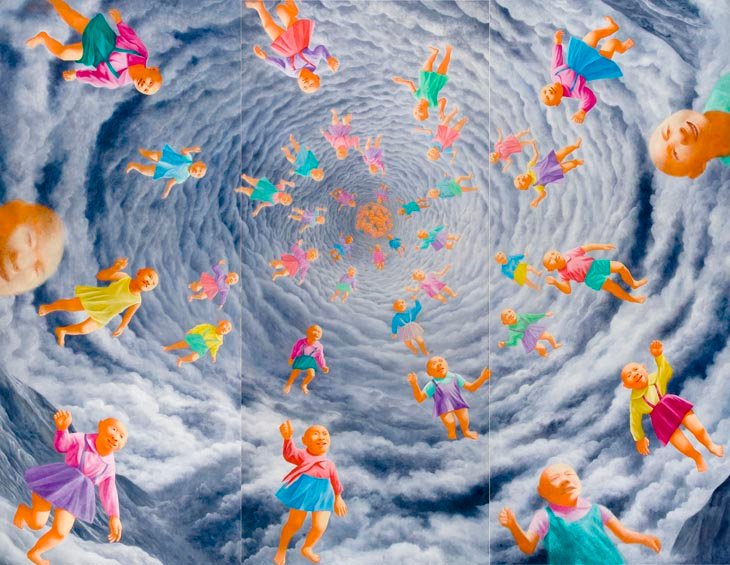 30th Mary (2006), de Fang Lijun. Las distintas figuras aparecen vestidas con ropas kitsch detono infantil y se disponen en un remolino de nubes sin fin, sonriendo.