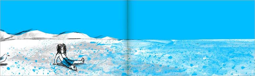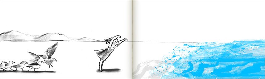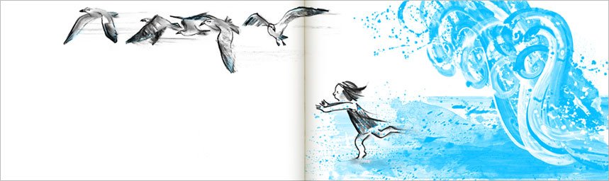 trabajando en campos y sobre la obra de artistas cercanos, llegué por pura casualidad a Suzy Lee y me gustó lo que veía. En especial, las primeras imágenes que tuve la suerte de observar, vinculadas al proyecto The Wave (“la ola” en español), que cuentan el encuentro juguetón de una niña con el mar, al que asusta, persigue y golpea hasta que éste le devuelve la diversión a través de una gran ola. Varias gaviotas actúan como testigos de los intercambios entre la pequeña niña y el, primero indefenso, y luego majestuoso océano. Unos pocos trazos son suficientes para formar el dibujo. Se constituyen gracias a una acuarela delicada y desleída, apenas esbozada pero dispuesta con precisión, creando gradientes de tonos que dejan tras de sí sombreados y contrastes que constituyen los distintos tonos y texturas de la obra. Apenas existen los fondos, lo que potencia el efecto de las manchas sobre el blanco, cielo infinito en el que sucede toda la acción.