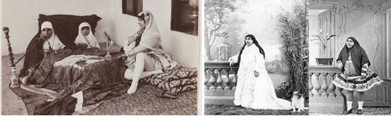 A la izquierda, la realidad del harén del Sha en el siglo XIX. Una de las mujeres fuma, acto que las mujeres occidentales no cometerían hasta los años 20, como símbolo de rebeldía. A la derecha, la favorita. Por entonces en Persia las mujeres amplias de carnes y con entrecejo eran beldades.