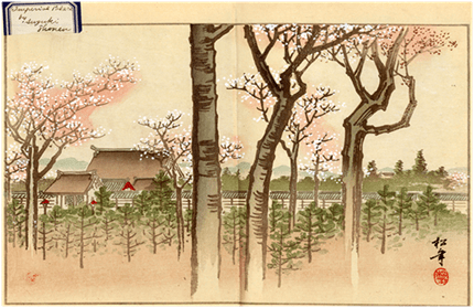 “Gosho”, Miyako meisho gafu, kokon shomeika zuga. Suzuki Shonen (1849–1918). Fuente: Library of Congress.
