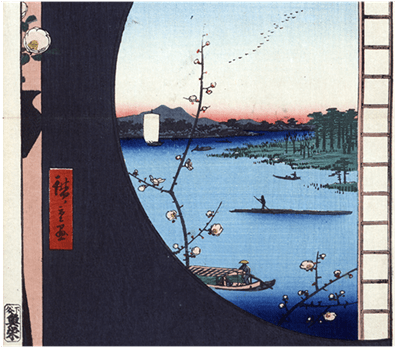 Massaki atari yori Suijin no mori Uchikawa Sekiya no sato o miru zu. Andô Hiroshige (1797–1858). Fuente: Library of Congress.