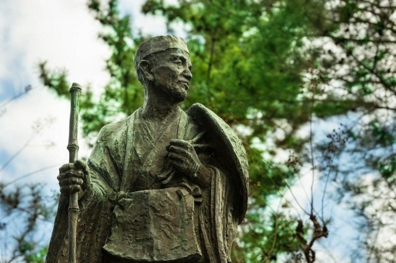 Estatua de Matsuo Bashô mirando hacia atrás en el parque Fudabagashi. Fotografía: Yoshiko Okamoto.