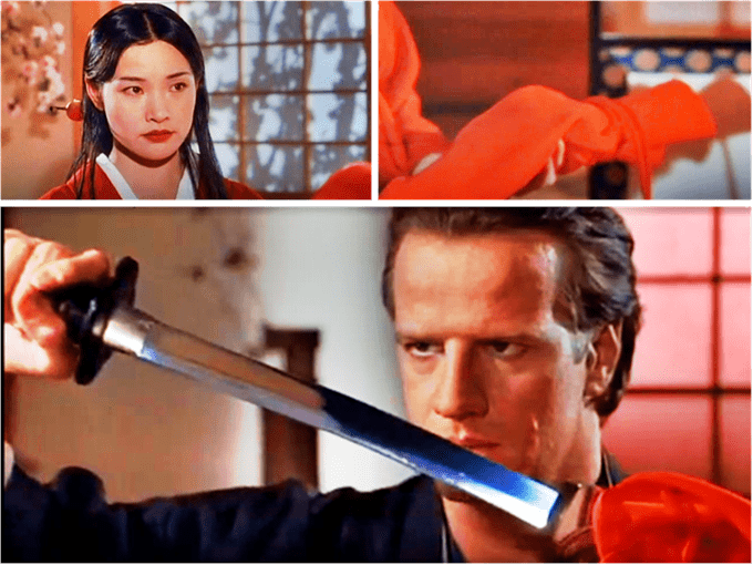 Si analizamos la película con la idea de una posible influencia del mito de onryô en mente, lo que de entrada parece un guion “sin gracia y sin sentido alguno” se vuelve mucho más inteligible. A grandes rasgos, la película narra la historia de Kirina y Paul Racine. Paul es un vendedor de chips de ordenador que está en un viaje de negocios en Japón. Karina es una misteriosa japonesa a quien conoce inesperadamente en un bar. No sabemos al principio que esta va a ser su última noche con vida, pero ella sí que lo sabe. Por las razones que sea, se deja llevar por una pulsión de vida y acaba saliendo con Paul Racine, disfrutando de todo lo que la noche tiene que ofrecer. Acaban en la habitación de hotel de ella donde ambos se dejan llevan por la pasión, un poco al estilo de la ya mencionada Pretty Woman. Al final de la noche, ella se despide de Racine diciéndole que no le va a volver a ver en la vida. Racine entenderá por qué estas palabras cuando vuelva a su habitación al darse cuenta de que sigue teniendo la llave de Kirina en su bolsillo. Al abrir la puerta, se encuentra cara a cara con una escena macabra: Karina está a punto de ser asesinada a manos de Kinjo, un “ninja” sicario y jefe de una secta llamada los Makatos. Rápidamente llama a la policía mientras observa la escena.