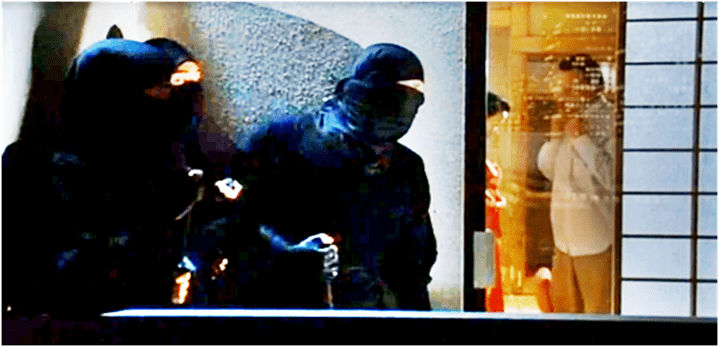 Fotograma mostrando cómo una banda de ninjas acecha a su presa.