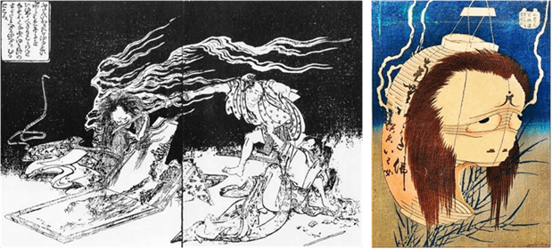 Dos representaciones de fantasmas de Hokusai (1760-1849). La primera un onryô y la segunda el fantasma de la linterna.