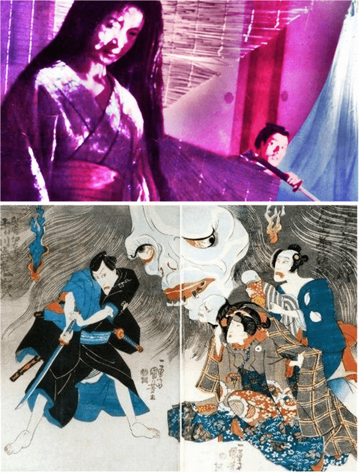 Una representación fílmica de Oiwa, Kaidan Oiwa no bore (El cuento del fantasma de Oiwa) de Kato (Japón, 1969) y abajo una representación artística del aspecto fantasmal de Oiwa (foto: Ranpo).