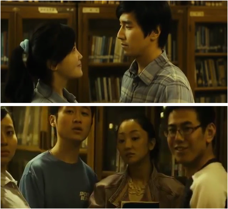 Fotogramas (arriba y abajo) mostrando la transición entre un plano medio-corto de la “la pareja” hablando a un plano medio corto de un grupo de personas observando incrédulos en la escena de la biblioteca del filme So Young de Zhao Wei (2013)