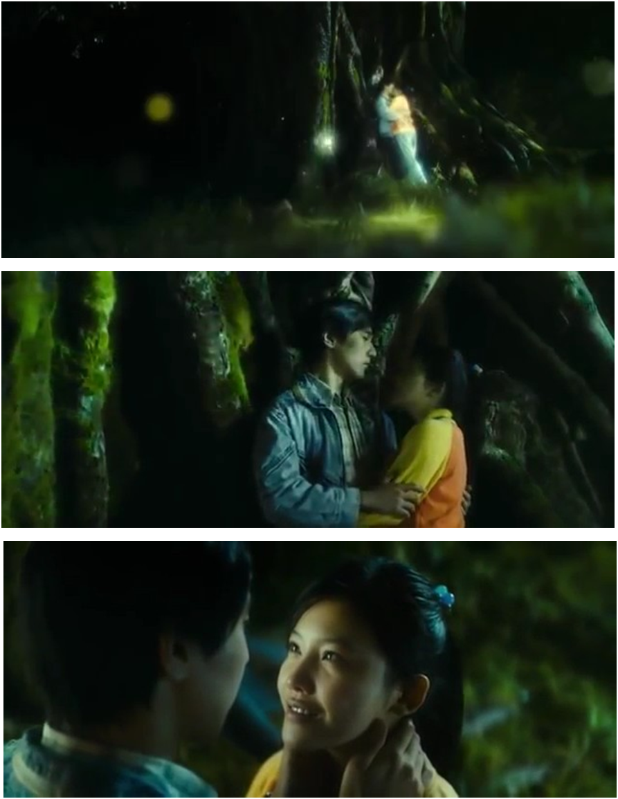 Fotogramas mostrando la gama de cambios de iluminación en la escena del beso de del filme So Young de Zhao Wei (2013)