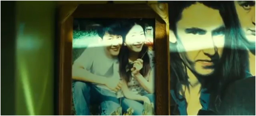 Fotograma que recoge tanto una foto de la pareja como la imagen del cantante de Suede, del filme So Young de Zhao Wei (2013)