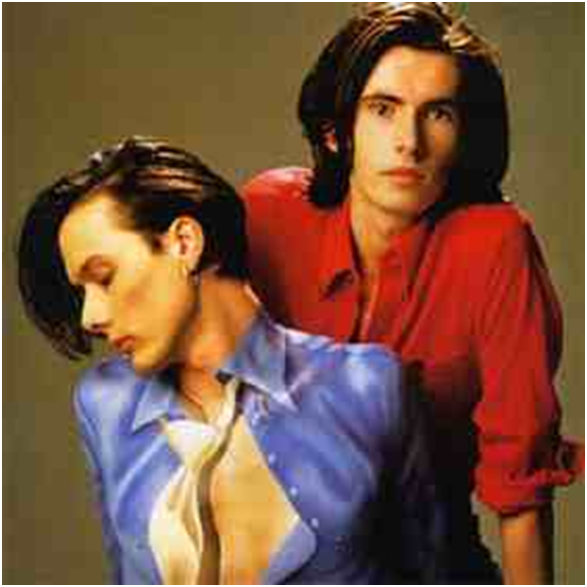 Imagen del cantante principal de Suede que muestra la ambigüedad de su identidad de género por la forma de vestirse, el corte de pelo, y su pose