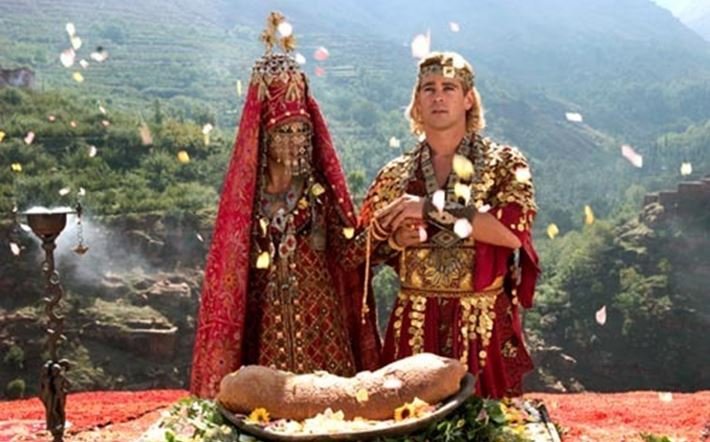 Recreación fílmica de 2004 en la que se refleja el uso trajes orientales por parte de Alejandro Magno, en este caso interpretado por Colin Farrel. Aquí vemos como lleva la diadema imperial persa por corona, una amplia faja dorada y túnica de seda.