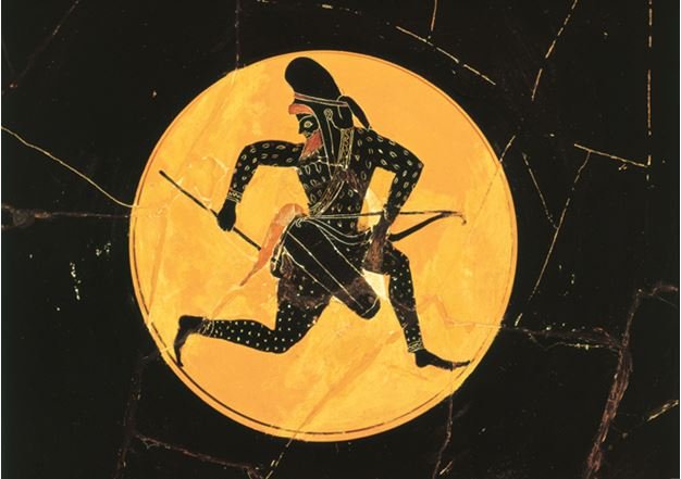 Arquero persa representado con el atuendo contemporáneo de época helenística en una pieza cerámica griega que representa a los ejércitos persas que luchaban para Alejandro Magno.