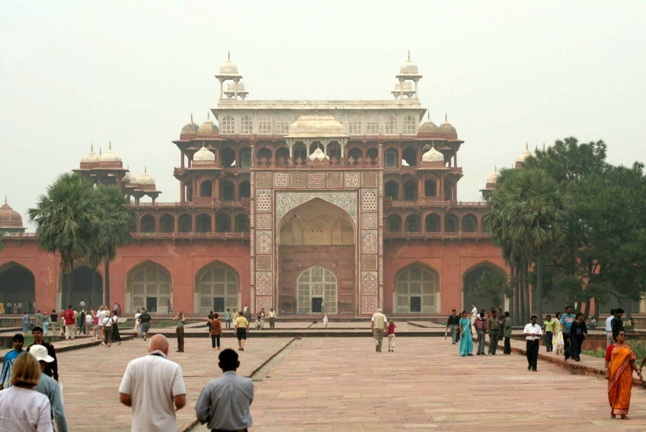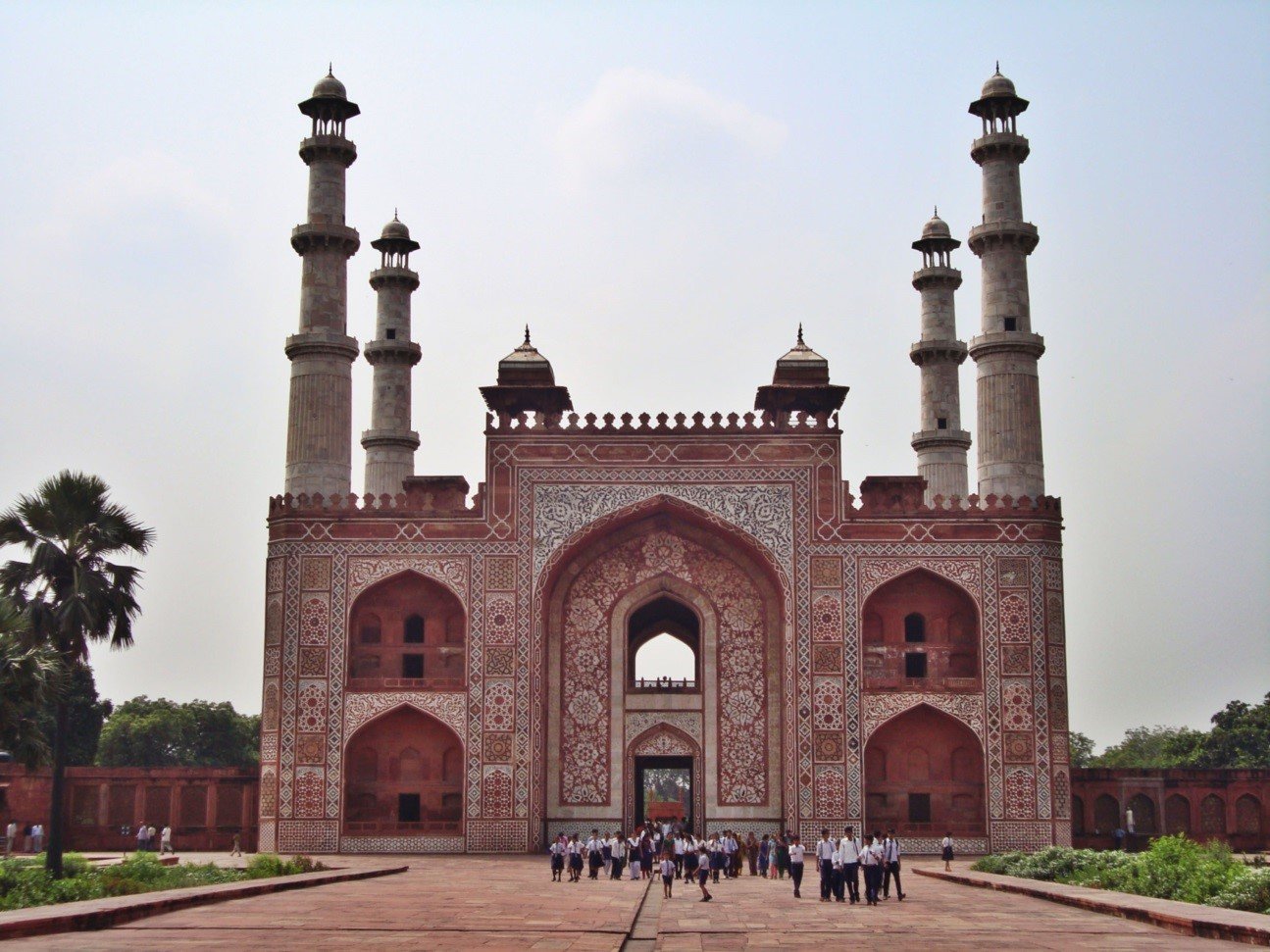 La tumba de Akbar fue construida en Sikandra, entre 1604 y 1614. Iniciada en vida, se conoce que, tras el acceso al trono de su sucesor, éste decidió modificarla en gran parte. La tumba se ubica en el centro de un jardín chahār bāgh, al que se accede a través de una portada meridional que se ornamenta con incrustaciones de mármoles y piedras de colores que forman motivos vegetales y geométricos. Sobre esta entrada, sobresalen cuatro alminares que aparecen aquí por primera vez en la arquitectura funeraria mogola plenamente desarrollados.