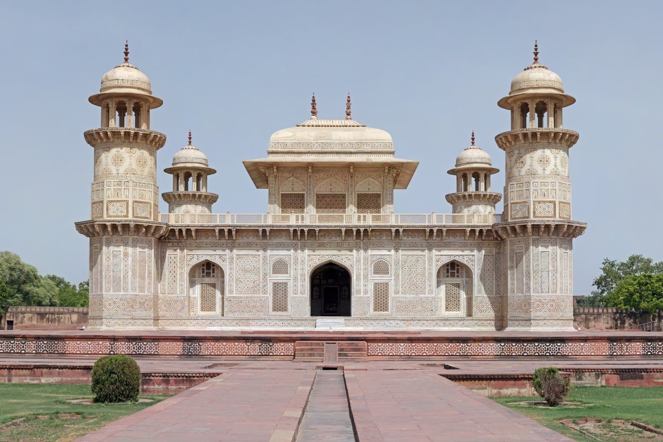 La tumba de I‘tmād al-Dawla fue levantada en Agra, entre 1626 y 1628, por Nūr Maḥal Begun,[15] esposa de Ŷahāngīr, con el fin de conmemorar a su padre, que ocupaba uno de los más altos cargos del imperio. Este mausoleo se sitúa en el centro de un jardín cuadrado y se eleva sobre un pequeño zócalo; consiste en una gran sala de planta cuadrada de 23 metros de lado, a la que se yuxtaponen cuatro torres de planta octogonal en los ángulos. La construcción es coronada por un pabellón circundado por delicadas celosías. Dan armonía a la fachada los tres arcos del nivel inferior, y la cornisa que recorre todo el perímetro del edificio. El mármol blanco se ornamenta en su superficie con incrustaciones de piedras semipreciosas, como el lapislázuli, el ónix, el jaspe o el topacio, creando diseños vegetales y geométricos. En el interior destacan los muros de mármol calado y los sepulcros de pórfido amarillo con incrustaciones.