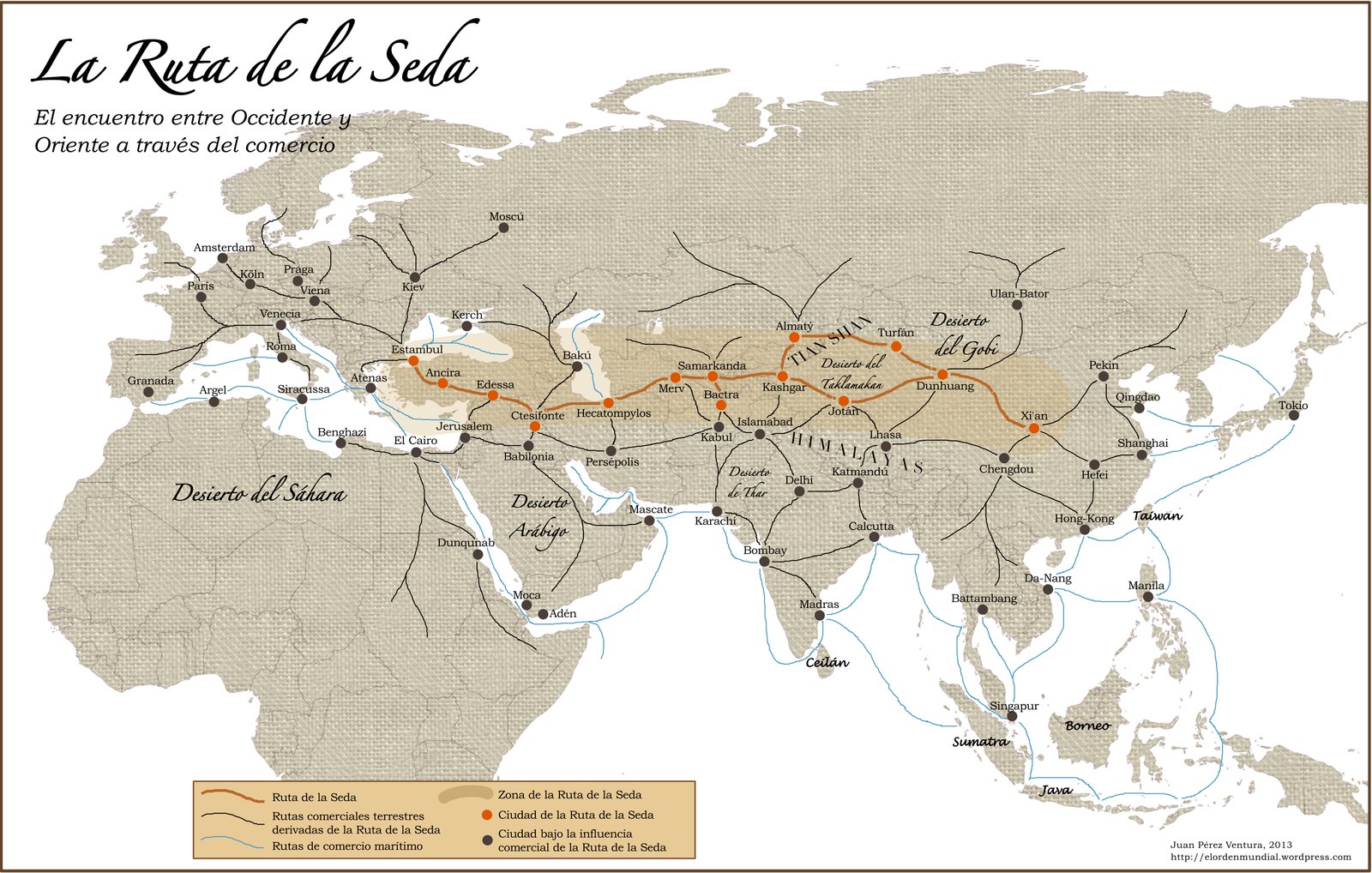 Se debe considerar que desde el siglo I a.C. se organizó la Ruta de la Seda en torno al comercio de este material surgido en China y que se llegó a extender a todo el continente asiático, conectando la ciudad actual de Xian (China) con Estambul (Turquía) y Alejandría (Egipto). Ello implicó que culturas tan alejadas como la egipcia en África, la griega y romana en Europa, pasando por Mesopotamia e India, hasta la china y japonesa, fuesen unidas por vías comerciales. Con antelación al esplendor de esta ruta existían contactos entre pueblos ubicados en regiones situadas a miles y miles de kilómetros, por lo que muchas teorías filosóficas pudieron ser influenciadas por otras surgidas en otras partes del mundo. Hay que tener en cuenta que durante el período védico (1300-900 a.C.) se produjo la entrada de arios (grupo indoeuropeo) en la India, por lo que a partir de entonces ya existía el contacto con otras civilizaciones, entre ellas la griega y, posiblemente, la egipcia. No obstante, la Ruta de la Seda influyó notablemente en la expansión de doctrinas filosóficas por toda Asia. En concreto permitió que, por ejemplo, el budismo saliese de la India y, atravesando las montañas del Himalaya, llegase a China y de ahí a otras partes del continente. También la doctrina islámica se vio favorecida en sus inicios gracias a esta ruta comercial, principalmente en su parte occidental, aunque llegó a China para quedarse en muchas de sus ciudades.
