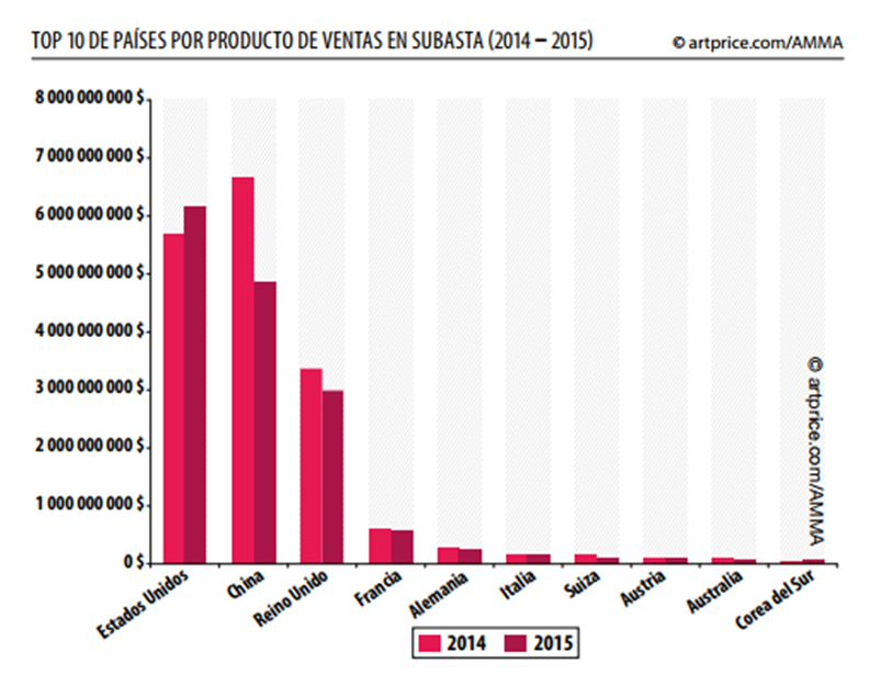 Top 10 de países por producto de ventas en subastas de obras de arte (2014-2015) según Artprice.