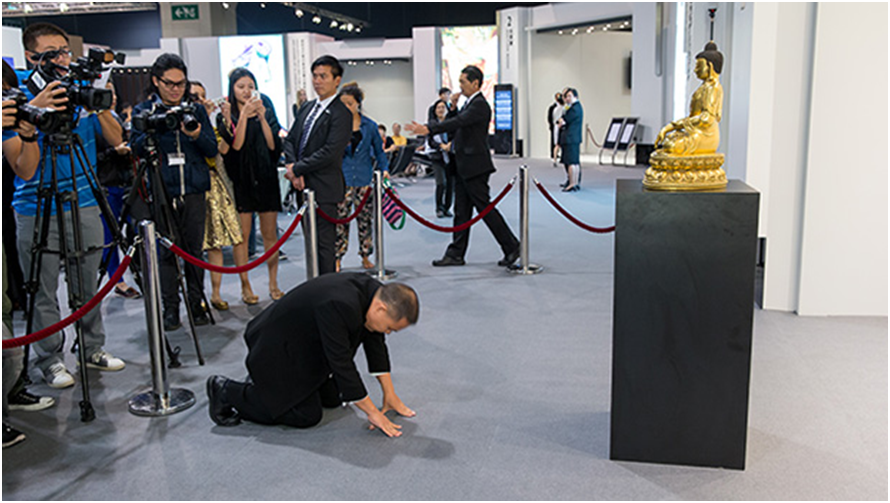 Zheng Huaxing orando frente a la estatua de Buda que compró en una subasta en Sotheby’s.