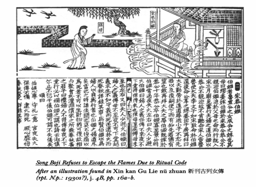 Asimismo, se consideran virtuosas aquellas que, al quedar viudas, mantienen su castidad. Esto se defendía en los textos exponiendo prácticas como la mutilación para no parecer atractivas a un segundo matrimonio o recurrir al suicidio para seguir a su esposo en la otra vida. El suicidio cobró más importancia posteriormente, en especial en la dinastía Ming,[8] donde se llegaba a premiar a la familia de la viuda por haber mantenido su honor realizando este acto. Asimismo, el suicidio también se consideraba una alternativa a la hora de rechazar un matrimonio no deseado o ante el mal porvenir de uno, constando como un signo de protesta y deshonor para la familia del marido. No obstante, para asegurar la descendencia masculina, se permitía el concubinato. El concubinato era una institución por la cual se permitían los matrimonios con más de una mujer, aunque estos eran de menor rango que el de la esposa oficial. Por otra parte, se consideraba prestigioso el poder tener varias mujeres, por lo que se daba más entre la clase alta. Este hecho queda reflejado en algunos pasajes en los que se insta a las mujeres a la resignación y a que no se opongan a los deseos del marido a la hora de contraer matrimonio de nuevo.