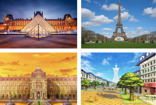 Comparación de lugares de Ciudad Luminalia con iconos turísticos de París.