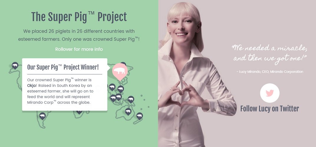 Así, en una primera secuencia magistral, conocemos el último gran proyecto de la multinacional agroalimentaria MIRANDO –claro calco de Monsanto, especialmente una vez se van revelando las recientes atrocidades ambientales de la misma-, cuya directora Lucy Mirando (una terroríficamente “cuqui” Tilda Swinton), presenta a la prensa una idea que revolucionará el panorama alimentario: el supercerdo, un tipo de cerdo gigante que, correctamente criado, salvará al planeta de la desnutrición, proporcionando carne suculenta y barata. Vendido como un verdadero prodigio de la naturaleza –aunque más tarde se revelará que no es otra cosa que una especie transgénica-, MIRANDO lanza una espectacular campaña de diez años para encontrar el mejor supercerdo, a partir de ejemplares que serán distribuidos por el mundo para que granjeros de diferentes lugares los cuiden de acuerdo a sus técnicas tradicionales. Con la prensa de su lado, una encantadora directora que viste de rosa y el carismático veterinario televisivo en nómina Johnny Wilcox (Jake Gyllenhall), no hay nada que pueda salir mal.
