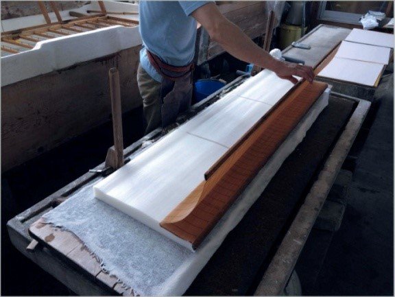 Proceso de elaboración del washi. Cuando las hojas de papel alcanzan el grosor deseado, se retiran del sukisu para prensarlas y secarlas junto con otras. Autor de la fotografía: Nakagita Yoshiaki. Fuente: Wikimedia Commons.