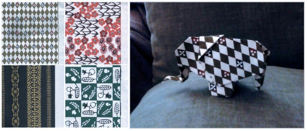 El genuino papel de origami es el chiyogami. Un tipo de choshi que se estampa a mano mediante serigrafía (estarcido a través de una tela, en principio de seda) con motivos que muchas veces imitan los de los kimonos. Por eso resulta tan llamativo que, en ocasiones, se utiliza como papel de regalo. A la izquierda, cuatro muestras de chiyogami. A la derecha, bonito elefante elaborado con uno de ellos por Raquel Álvarez Arias, especialista en papiroflexia. Digitalizaciones y fotografía de la autora.