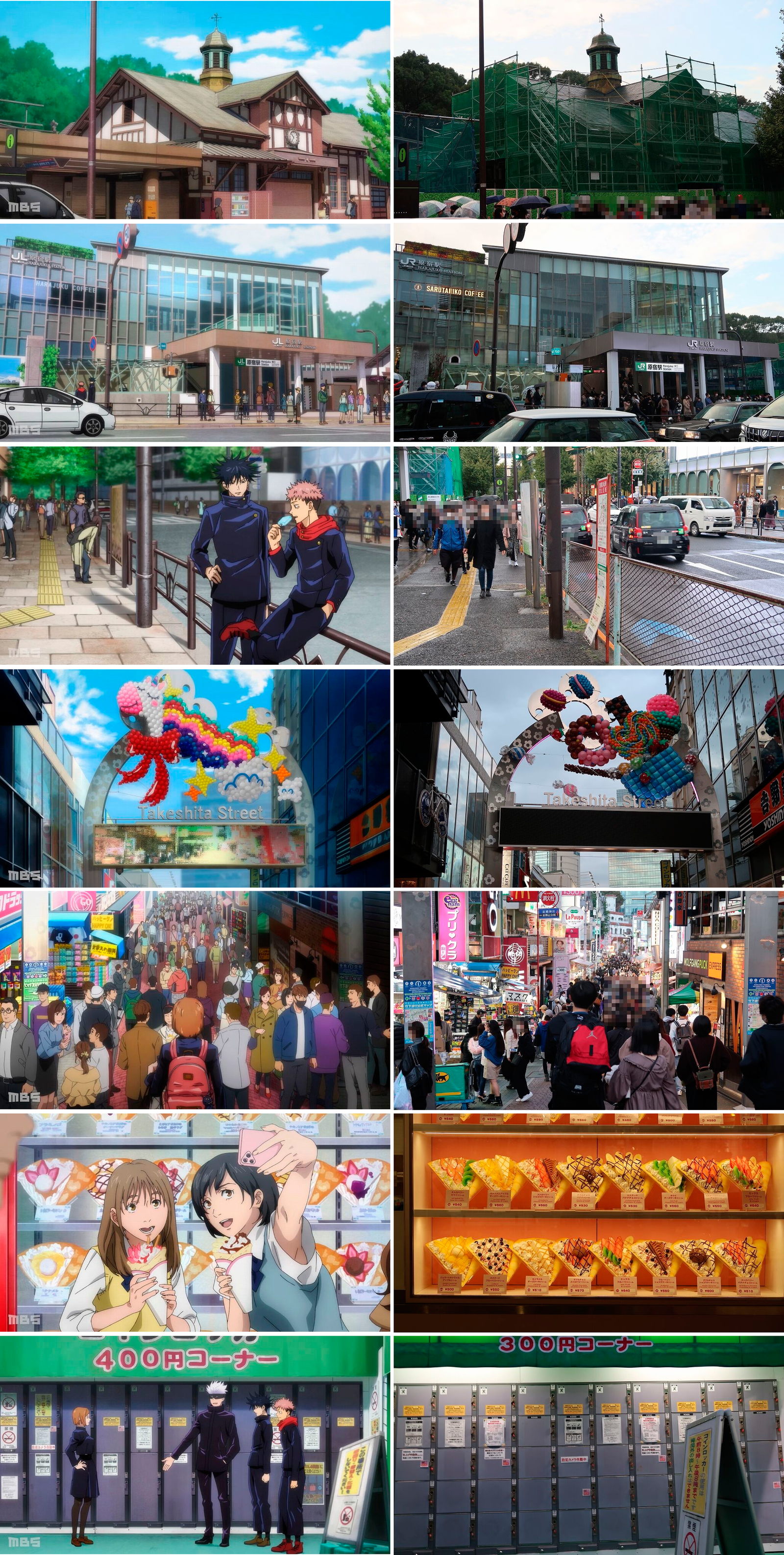 También aparece en varias ocasiones Takeshita-dôri, la calle más famosa de Harajuku, parte del distrito de Shibuya. Ya es mencionada en el volumen cero, cuando Nanako y Mimiko le piden a Suguru que las acompañe a comer crêpes allí ya que, aunque son un dulce que puede comerse en todo Tokio, es en la calle Takeshita donde se encuentran las tiendas más famosas especializadas en este dulce. Pasando a la historia principal, Yûji y Megumi están esperando a Gojô delante de la salida oeste de la estación de Harajuku y, a pesar de que la acción del manga sucede en 2018, además del edificio clásico en el anime también aparece la versión mucho más genérica y moderna que se construyó en marzo de 2020, dando lugar a una incongruencia temporal. Nobara amenaza al cazamodelos del edificio Harajuku Alta, y después deja su equipaje en los casilleros Fuji