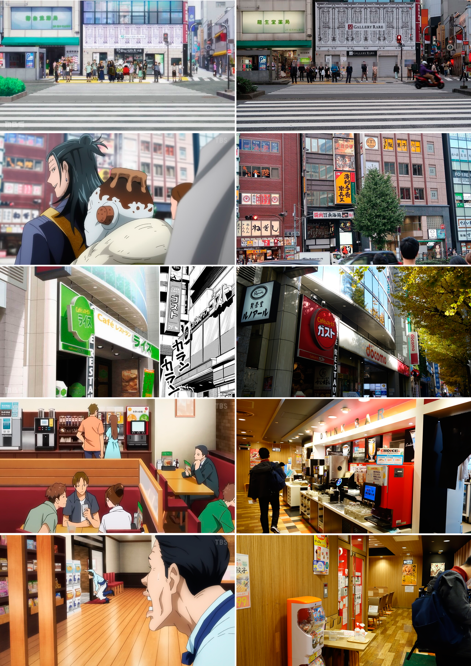 Comparación de Shinjuku en el anime de JJK (izquierda) y en la realidad (derecha). En el primer par de imágenes puede verse la farmacia Ryûseidô y la tienda Gallery Rare detrás de los personajes a la izquierda y a la derecha respectivamente. En el tercer par de imágenes, a la izquierda, en los carteles verde pone “raisu” mientras que en la viñeta del manga pone “gosuto”.