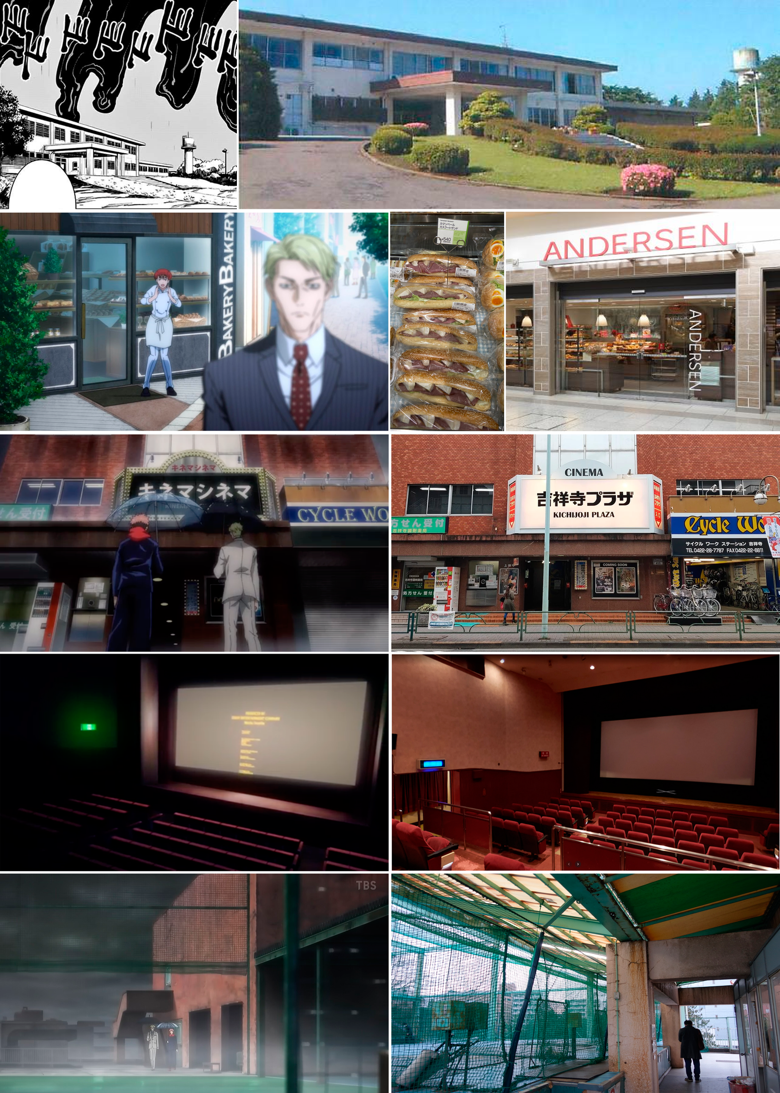 Comparación de distintas localizaciones de Tokio en el anime de JJK (izquierda) y la realidad (derecha): el correccional de Tama (arriba), la panadería que frecuentaba Nanami (segundo par de fotos), y distintas partes del complejo comercial Kichijôji: el cine por dentro y por fuera, y el centro de bateo.