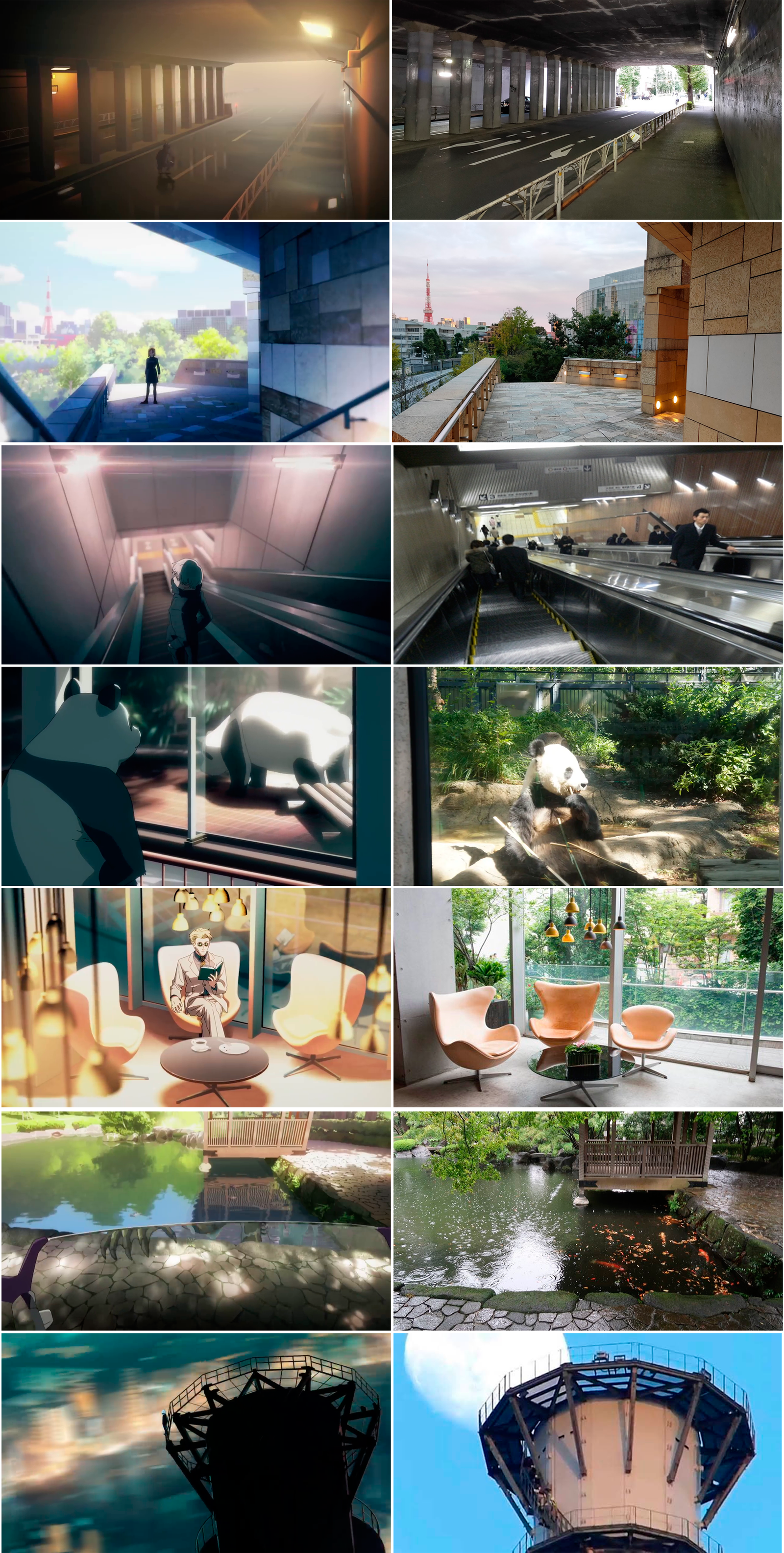 Comparación entre escenas de la primera parte del primer opening de JJK (izquierda) y las localizaciones reales (derecha) protagonizadas por Megumi, Nobara, Inumaki, Panda, Nanami, Maki y Gojô, respectivamente.