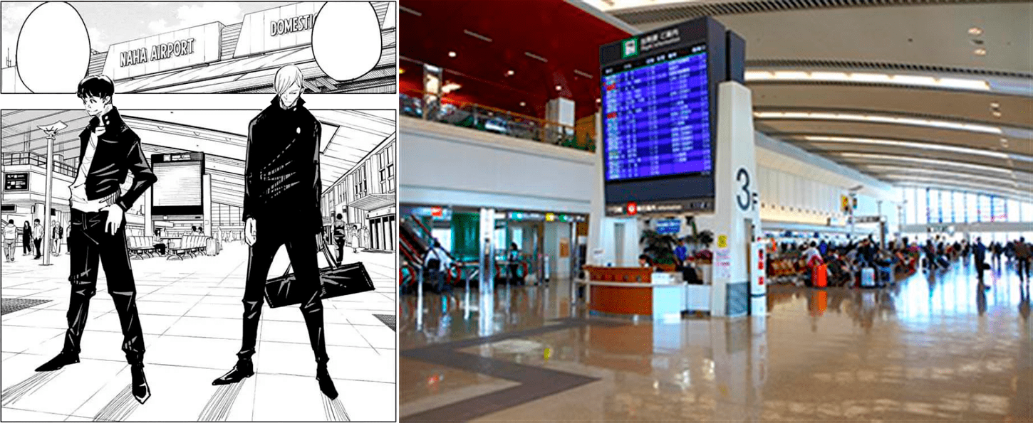 La isla de Okinawa aparece en el volumen ocho, cuando los hechiceros Satoru, Suguru y su protegida Riko van a rescatar a su cuidadora y amiga Kuroi, quien había sido secuestrada. Tras salvarla con éxito, el cuarteto decide pasar el día disfrutando de la isla por lo que, aunque esta parte sólo ocupa doce páginas, aparecen los lugares más emblemáticos de este entorno paradisíaco. La primera localización que vemos es el vestíbulo del aeropuerto de Naha, donde los hechiceros Nanami y Haibara están haciendo guardia.