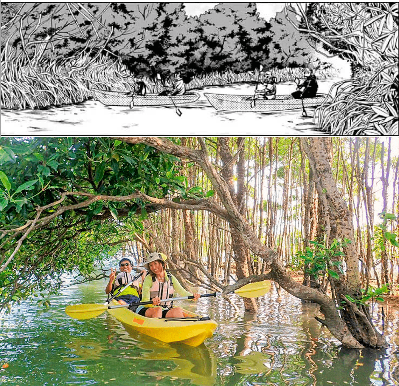 Tras pasar el día en la playa y decidir que van a alargar su estancia, Riko y compañía dan un paseo en kayak por el manglar del río Okukubi en hoku-bu (el distrito norte de la isla), una actividad muy popular entre los turistas.