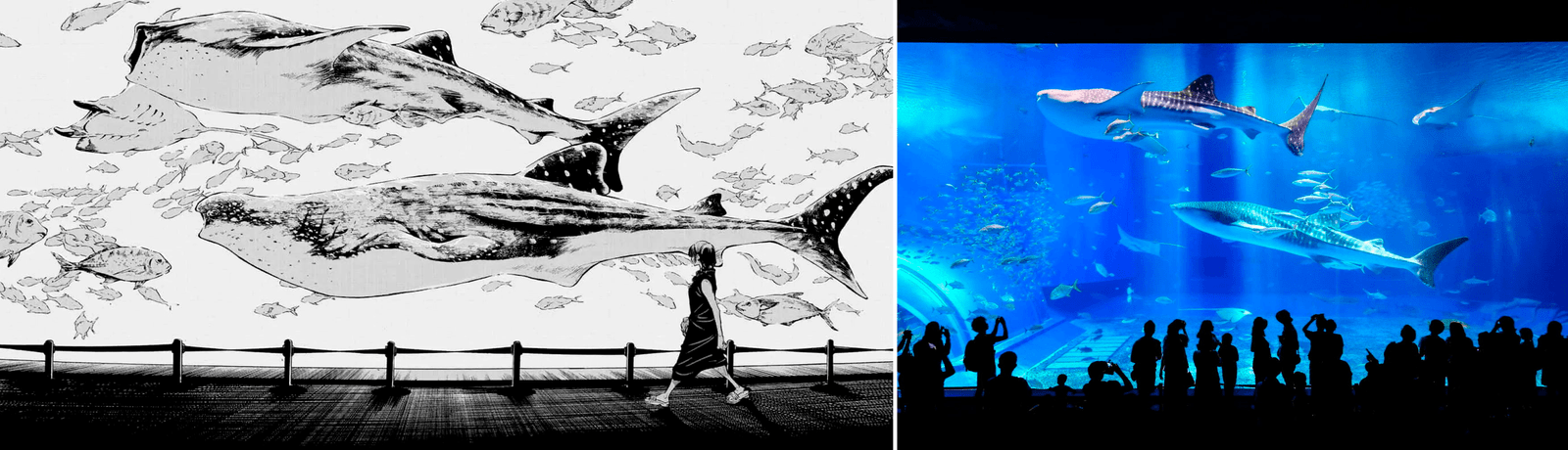 La última parada es el acuario, donde podemos ver en una preciosa viñeta a doble página a Riko prendada mirando el tanque de los tiburones ballena, que efectivamente viven en las instalaciones.