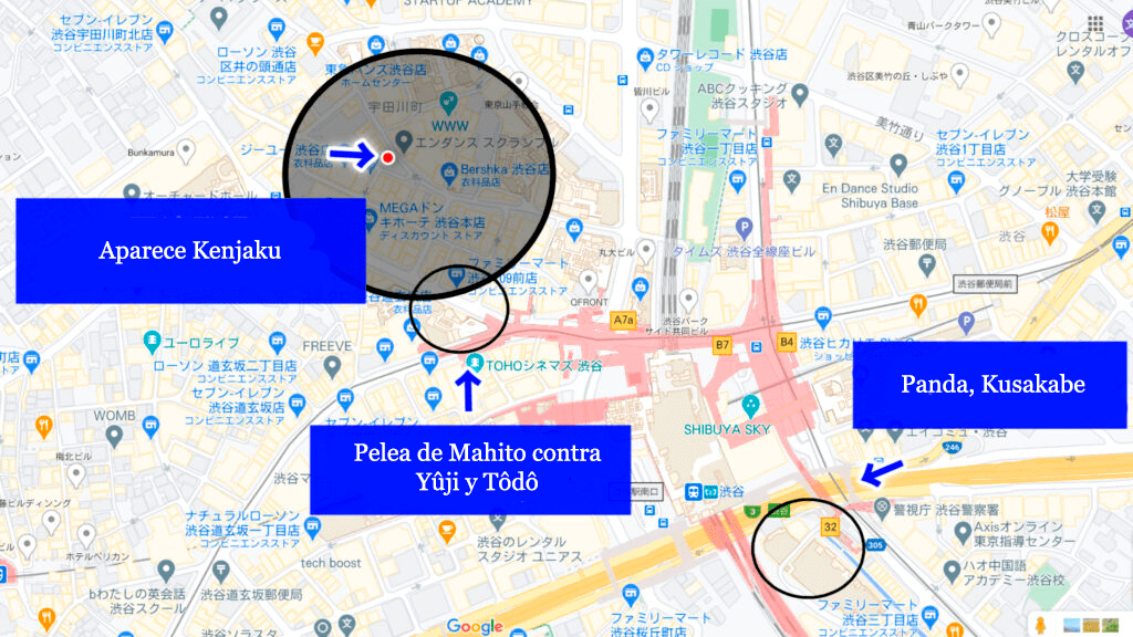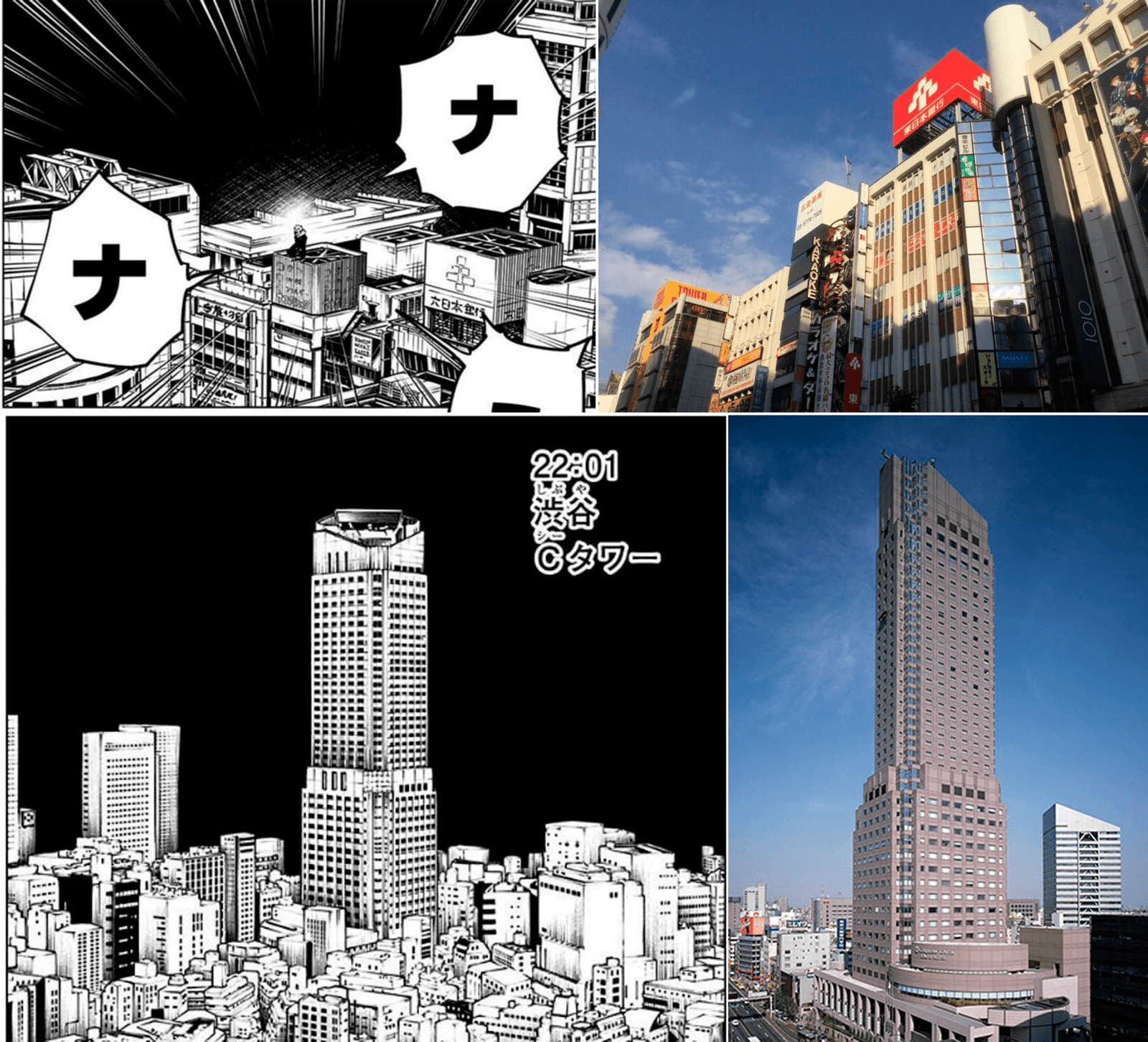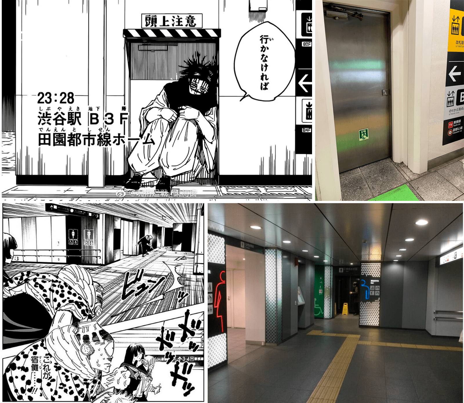 La última localización que vamos a explorar es Shibuya, en concreto la estación y sus alrededores, donde se desarrolla la saga de El Incidente de Shibuya, en referencia al atentado que perpetra allí el brujo Kenjaku durante la noche de Halloween de 2018. Varios equipos de hechiceros tienen que coordinarse para detener el ataque, por lo que se mencionan constantemente lugares concretos a los que tienen que dirigirse lo que, añadido a los carteles de las estaciones, ha facilitado a los fans la labor de situar cada una de las escenas de esta saga; después de todo, los nombres de las vías públicas no están sujetos a leyes de copyright y, aunque no es habitual que en los mangas y anime se recorran de manera tan explícita localizaciones reales, incluso si se “copia” tal cual un paisaje no suele indicarse cuál es excepto que sea por motivos promocionales, consideramos que es una excelente manera de entremezclar el mundo de JJK con el nuestro.