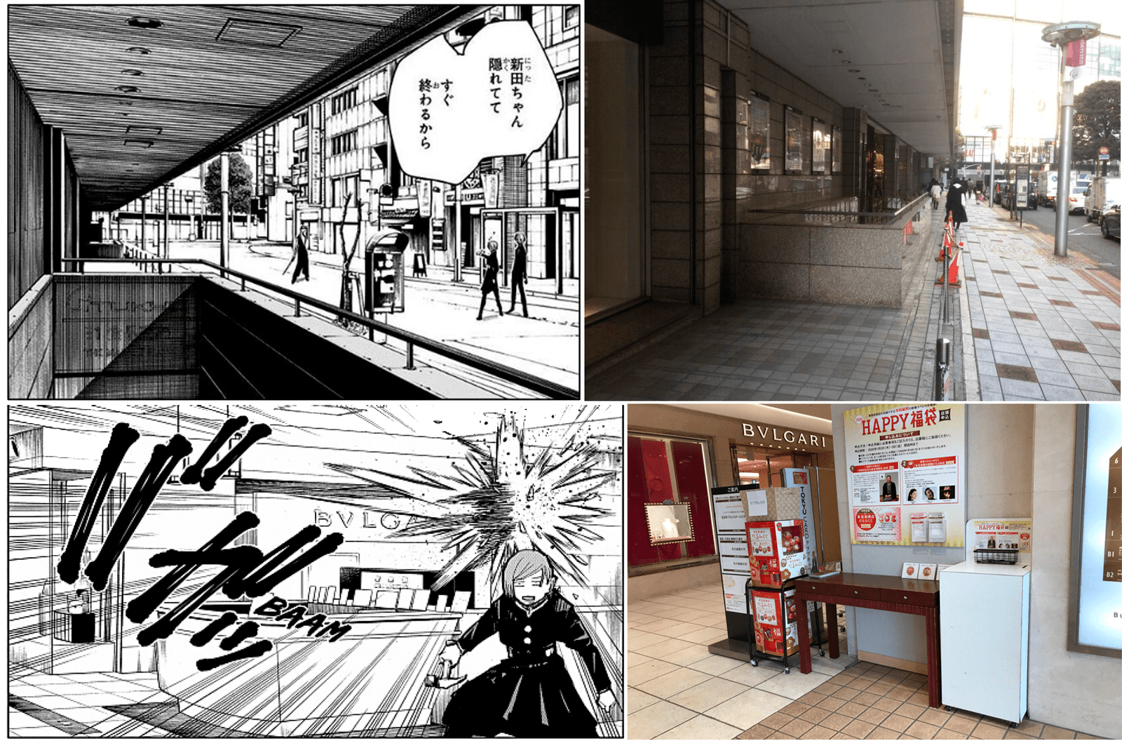 Después de que Ijichi interrumpa la comunicación al ser atacado, Nobara y Nitta se dirigen hacia el puente peatonal de la calle Meiji, siendo interceptadas delante de la sede principal de los grandes almacenes Tôkyû. La acción pasa luego al interior del complejo donde interviene Nanami, quien estrella a Haruta contra el escaparate de Bulgari, perfectamente identificable a pesar de que en el manga la onda de choque oculta la mitad del nombre.