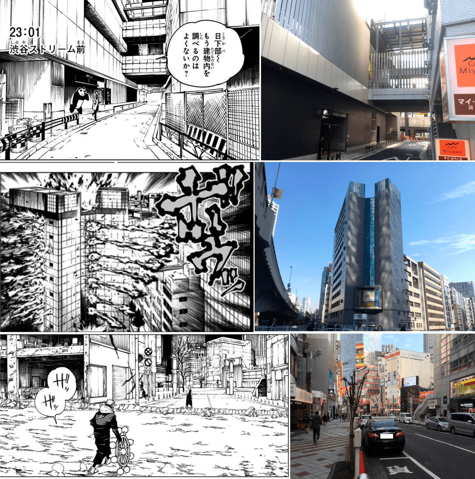 Después de que Gojô sea sellado en la Gokumonkyô, Yûji sigue las órdenes de “Mechamaru” y va a informar a Nanami desplazándose desde la estación delante del Meiji-jingû hasta la de Shibuya, un paseo de unos diez minutos, y se sube al edificio colindante al de la sede del banco Higashi Nippon, identificable gracias al logo, y cuyo nombre en el manga se ha alterado por Roku Nippon Ginkô. Asimismo, lo que llaman la torre C en el manga, donde Yûji, Megumi e Ino pelean contra la abuela Ogami y su nieto, es la Cerulean Tower perteneciente a la corporación Tôkyû, mientras que la pelea contra el brujo Awasaka sucede en la autopista de enfrente. Ijichi, por su parte, es acuchillado por Haruta en el lugar donde antes estaba a la espera el equipo de Nanami (puente peatonal de la calle Meiji).