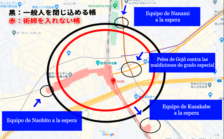 Traducción del mapa del Incidente de Shibuya (la fuente de la fotografía puede encontrarse en el apartado de Referencias). La leyenda de arriba indica que el círculo negro es el rango de la cortina que atrapa a la población civil mientras que el círculo rojo se corresponde con la cortina que impide la entrada de los hechiceros.