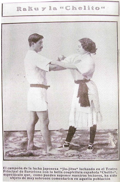 También había otro tipo de contendientes, mucho más llevaderos: políticos, toreros e incluso coristas se enfrentaron al japonés, y atendieron a las lecciones de jujutsu. Uno de los casos más recordados fue el de la cupletista Chelito, una de las máximas bellezas del momento, quién aceptó encantada las clases de Raku. Sólo la idea de verla preparada para el combate avivó hasta a la prensa del ejército tratando el tema como espectáculo “muy culto”, aunque dejan el siguiente comentario: “Ya entre dos varones es algo repugnante ese frotamiento de músculos desnudos y revolcarse por el suelo; ¡Qué no será cuando uno de los luchadores pertenezca al bello sexo!“. De las conexiones del luchador con el mundo del espectáculo surgen innumerables incertidumbres y rumores, aunque posiblemente el más llamativo surgiera a finales de 1908, cuando surge la idea de que Raku podría dedicarse al mundo del toreo por ser una carrera “más lucrativa y duradera”.