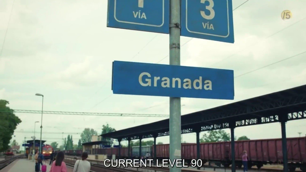 En la primera reseña fui bastante crítica con las inexactitudes geográficas que contiene la serie. El acento latino de muchos personajes de una serie que está ambientada en Granada o las esteladas catalanas que se ven en la serie son ejemplos de esto. También mencioné que la estación de trenes de Granada está inoperativa, lo que causa que las escenas en las que muestran a los personajes llegando a dicha estación sean chocantes y confusas para cualquiera que haya visitado la ciudad andaluza. Un plano que se repite a lo largo de la serie es el que mostramos abajo, dando a entender que los personajes están llegando a Granada. Sin embargo, se ve que es una pegatina sobre el nombre de la estación en la que lo grabaron. Estos pequeños detalles, aunque no afectan a la trama, resultan chocantes para un espectador español que conoce la situación política en Cataluña o la situación ferroviaria de Granada.